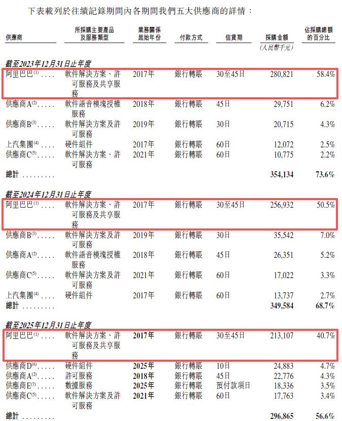 在采购端,阿里巴巴为斑马智能第一大供应商。申报期内,公司上前五大供应商的采购额占总采购额的比例永别为73.6%、68.7%和56.6%。其中,阿里巴巴连络三年位列第一大供应商。申报期三年间,斑马智能向阿里采购了全球云计算、舆图等中枢作事,采购额永别高达约2.81亿元、2.57亿元和2.13亿元,占比永别达到58.4%、50.5%和40.7%。