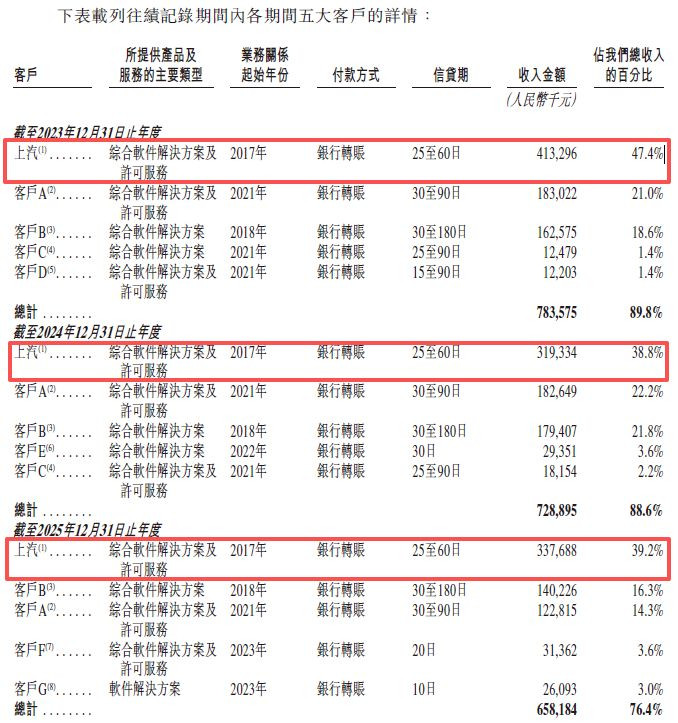 在销售端,斑马智能呈现出极高的客户联接度。申报期内,斑马智能来自前五大客户的收入占总收入的比例永别为89.9%、88.6%和76.4%。其中,上汽集团连络三年稳居第一大客户。申报期三年间,斑马智能朝上汽集团提供的详尽软件处罚有洽商及许可作事永别产生约4.13亿元、3.19亿元和3.38亿元的收入,占同期总收入比例永别高达47.4%、38.8%及39.2%。这意味着,斑马智能近四成营收依赖上汽集团。一朝上汽集团的销量或采购战略发生波动,斑马智能的基本盘将靠近较大影响。