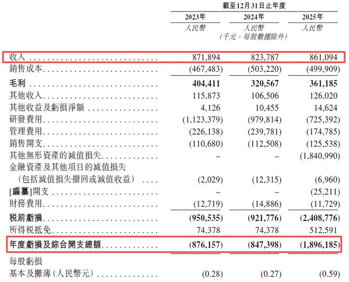 具体来看,2023年、2024年和2025年(以下简称“申报期内”),公司营业收入永别约为8.72亿元、8.24亿元和8.61亿元,呈现波动态势。与此同期,公司损失范围在2025年扩大。2023年和2024年,公司永别损失约8.76亿元和8.47亿元,2025年损失增至约18.96亿元。庞大损失的径直原因,是公司在2025年证据了一笔高达约18.41亿元的其他无形钞票减值损失。