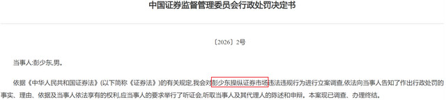 近日,证监会官网公布证监会〔2026〕2号、3号罚单,彭少东、王政因控制证券市集,差别被“没一罚二”罚没3762.44万元、3862.93万元。