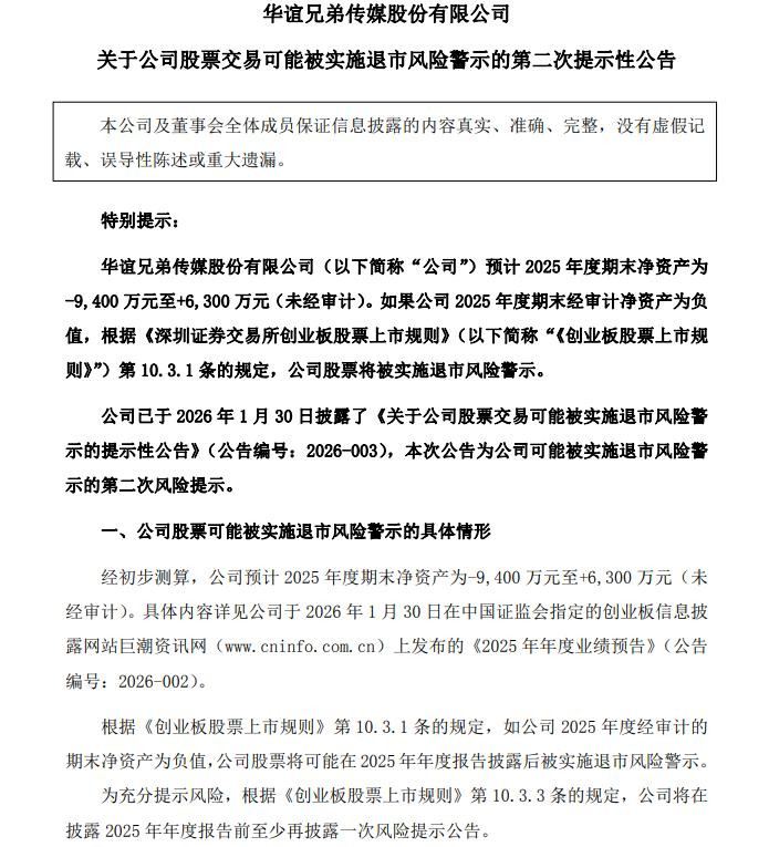 更令东说念主担忧的是净金钱的变化。3月13日,华谊伯仲发布公告,公司瞻望2025年度期末净金钱为-9,400万元至+6,300万元(未经审计)。若经审计的2025年度期末净金钱为负值,证据《深圳证券往返所创业板股票上市司法》第10.3.1条的规定,公司股票将在2025年年度讲述败露后被实施退市风险警示。公司2025年年度讲述瞻望于2026年4月29日败露,最终财务数据以郑重败露的经审计讲述为准。若年报说明期末净金钱为负,公司将于年报败露当日同步败露股票往返将被实施退市风险警示的公告,股票于公告后停牌一天,复牌之日起实施退市风险警示。