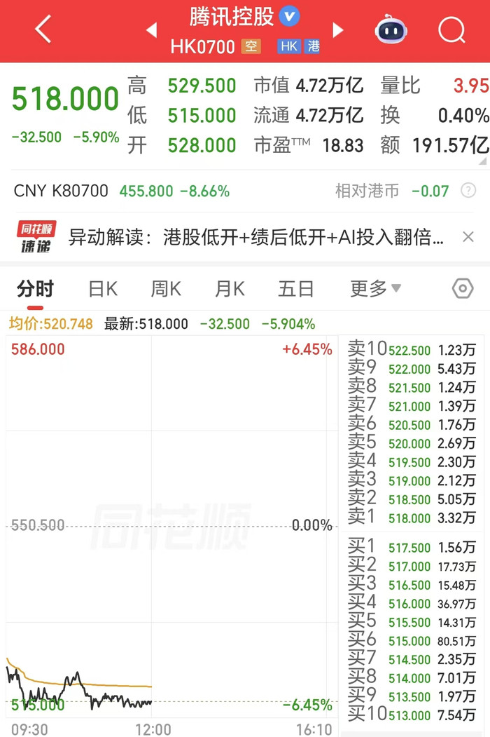 3月19日,腾讯控股(00700.HK)开盘大跌,一度跌超6%。末端上昼收盘,其股价为518港元/股,跌幅为5.9%,市值跌破5万亿港元至4.72万亿港元。