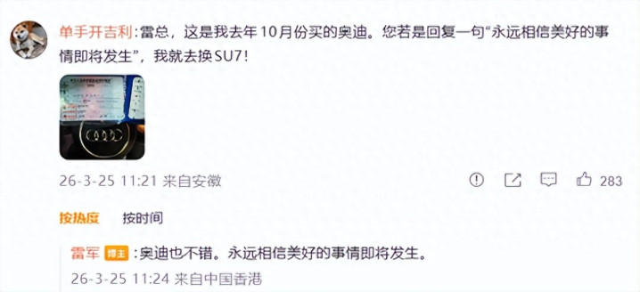 故事的发轫,要从3月25日那场全网围不雅的互动提及。安徽网友@单手开祯祥 在雷军的微博评述区,晒出了我方旧年10月刚提的奥迪,飞快立下赌约:“雷总,您要是回复一句‘经久投降好意思好的事情行将发生’,我就去换SU7!”