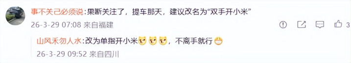 还有网友玩起了暖心梗,在线给车主提更名提倡:“浮滑温雅了,提车那天,提倡更名为‘双手开小米’”。