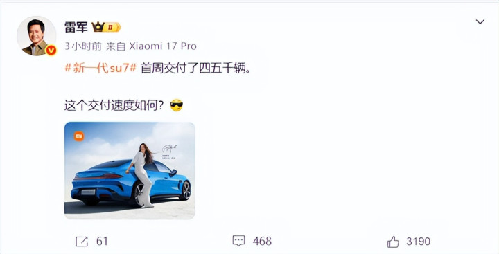 3月23日的首批委派行径上,雷军更是切身到场为车主开门,赤忱拉满。凭证雷军公布的最新数据,新一代SU7首周就委派了四五千辆,一改以往动不动等车半年的吐槽。