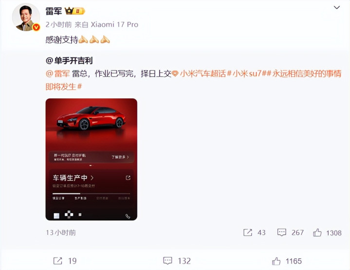而就在昨晚,这位车主用最干脆的步履,给了扫数东说念主谜底。他平直晒出小米SU7的订单截图,发微博@雷军:“雷总,功课已写完,择日上交”。