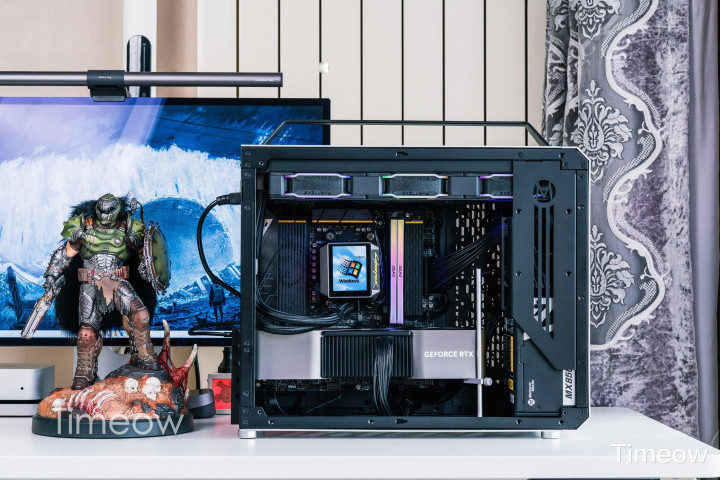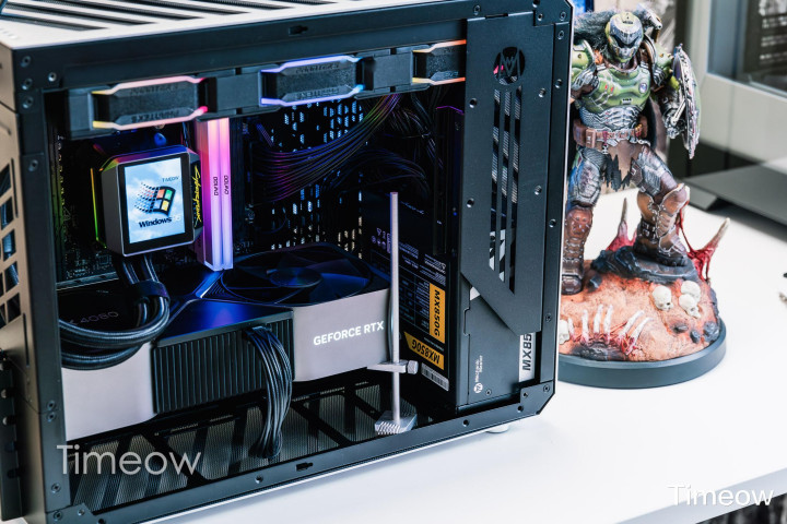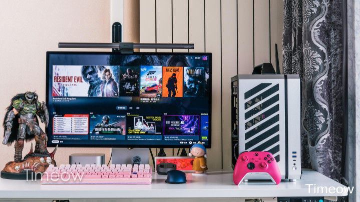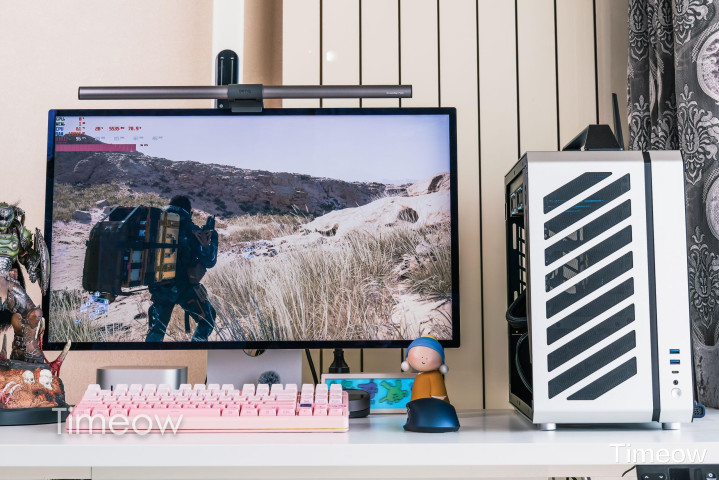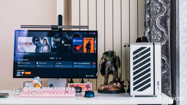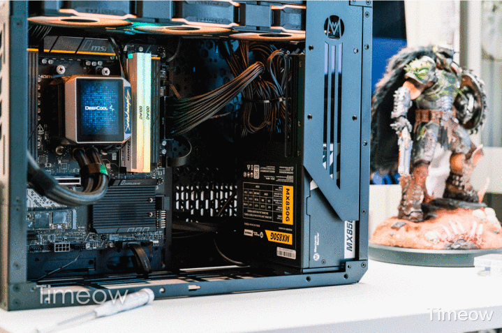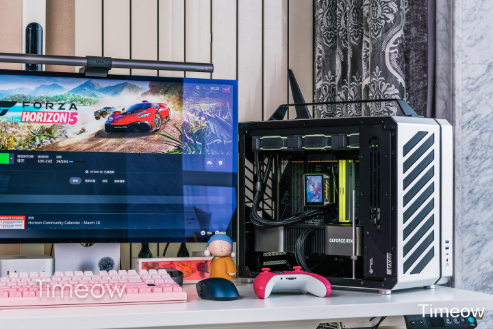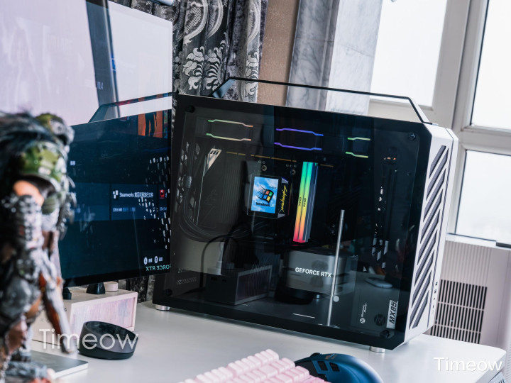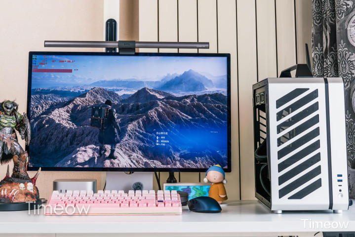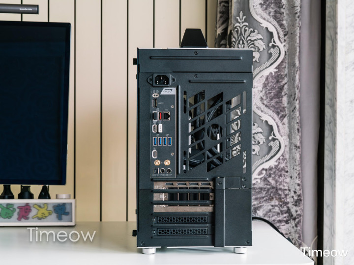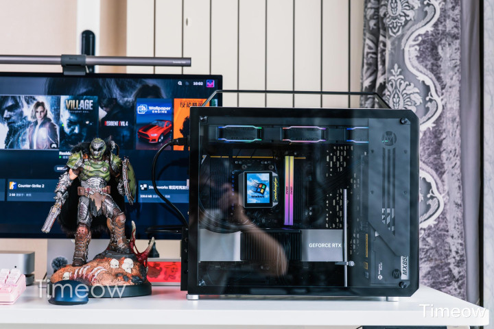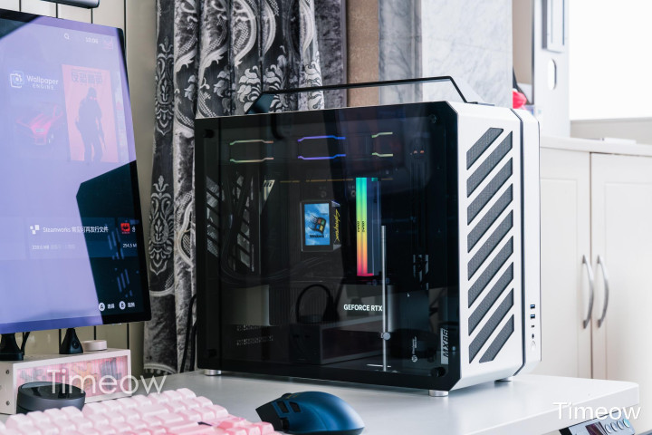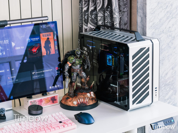 在桌面上的情状,机箱工整到连我的12寸手办都显得宽敞威猛了。