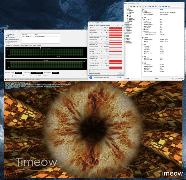 在10多分钟的烤机测试里,整机的性能开释相称安稳,CPU使用率长期是直线,供电安稳在140W;GPU供电也基本是稳稳的一条直线、安稳在320W操纵,都莫得明显波动,供电相称稳了。