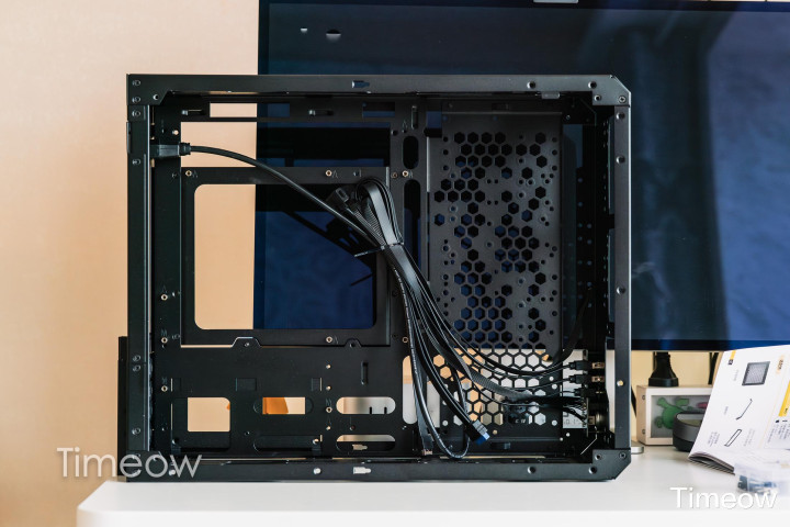 若是你要装MATX主板+水冷,我提议你按照讲明书,像我图上这么,将主板位置向下移动两个PCIE槽位。这么可以供水冷预留更多空间,减少与主板和CPU供电线的转折,何况插散热器连线也更便捷、主板的散热装甲也不会被挡住。
