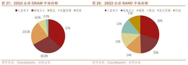现在外洋主要由三星、SK海力士、好意思光三大存储原厂占据世界主要份额,国内DRAM第一供应商长鑫存储2025年三季度占世界份额的8%,另一家国产NAND龙头长江存储2025年三季度占世界销量份额的13%,见地2026年占世界份额的15%,扩产后供应量瞻望占世界20%。