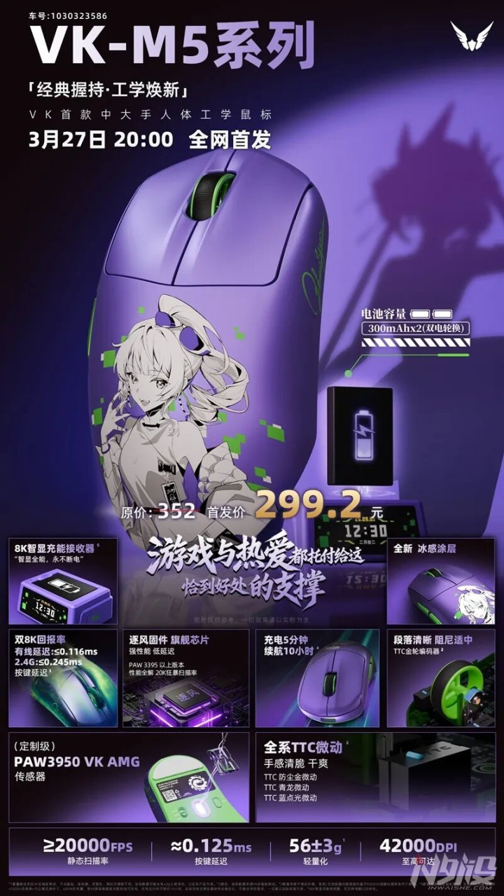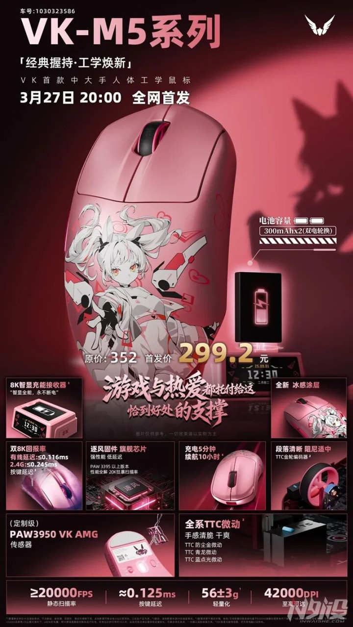 高配VK M5 PRO有两个主题,且更高阶的冰感涂层,傍边按键TTC蓝点光微动,滚轮TTC金轮编码器,且接纳了PAW3950 VK AMG传感器,双8K答复率,带智显充能收受器,电板为300mAh,续航170小时,分量松开至约56g。