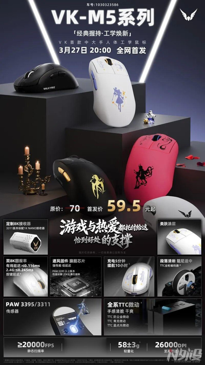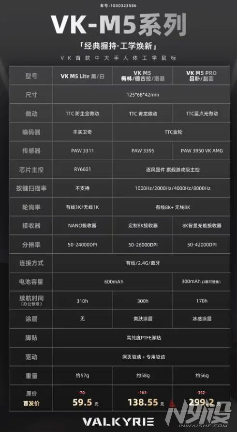 VK首款中大手右手东谈主体工学模具鼠标,M5系列细腻发布。依旧推出有多个建树版块,价钱最低59.5元,中配138.55元,高配也仅299.2元。