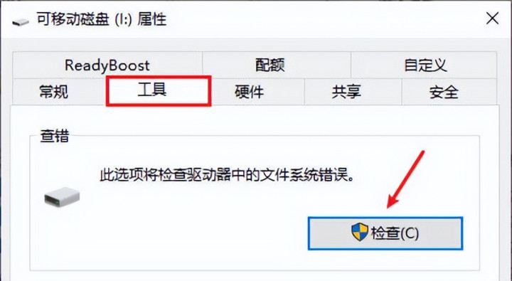 右键U盘→“属性” → “器具” → “查验” → 勾选“成立此驱动器” → 恭候成立完成。