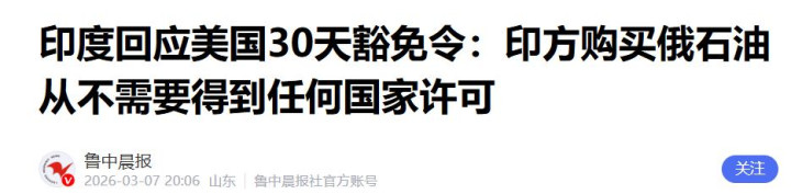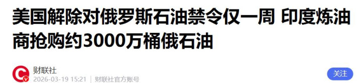 华盛顿不得不遑急启齿子。3月5日,好意思国财长贝森特发布晓谕:为确保原油合手续流入大家市集,好意思国赐与印度为期30天的临时豁免,允许其采购俄罗斯原油——仅限于3月5日前已装船的在途货品。