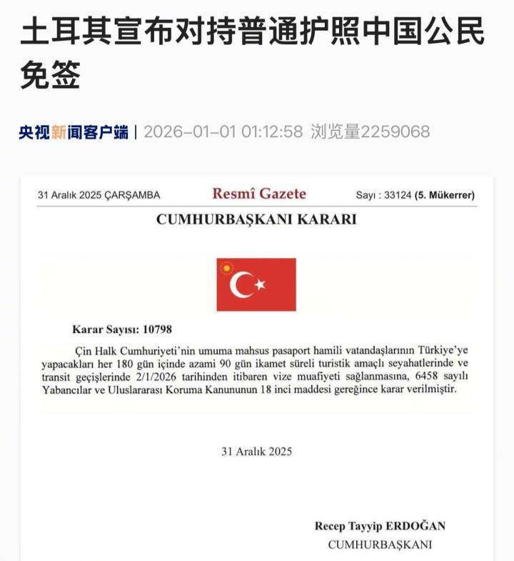 2026年1月2日,土耳其追究对中国公民推行片面免签,停留期30天,意在诱骗中国旅客、补充外汇。