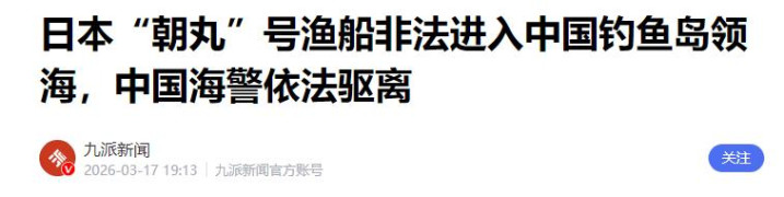 九派新闻——日本“朝丸”号渔船违纪投入中国垂钓岛领海,中国海警照章驱离——2026年3月17日