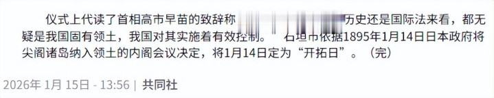 他马上代读高市早苗的致辞,妄称垂钓岛是日本“固有版图”,试图为登岛步履披上“正当”外套。