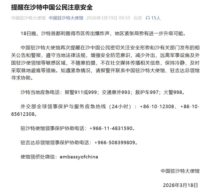 驻沙特使馆领事保护协助电话:+966-11-4831590。