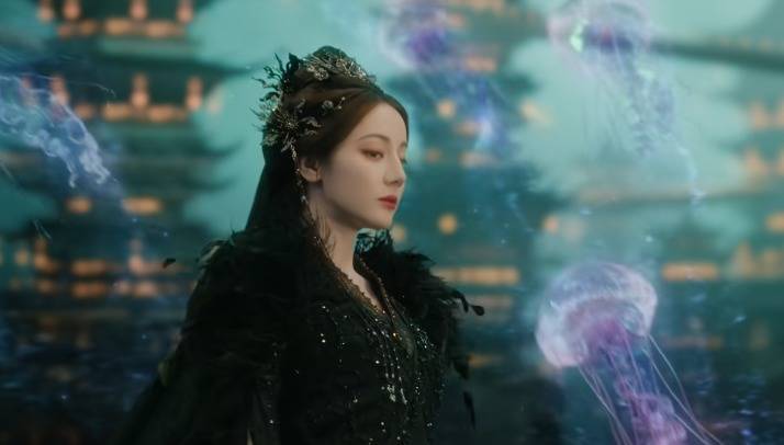 剧中女主刚出场的时候,百鬼夜游,跪地见礼,东说念主群中一皆翩然身影脚踏水母从天而下。