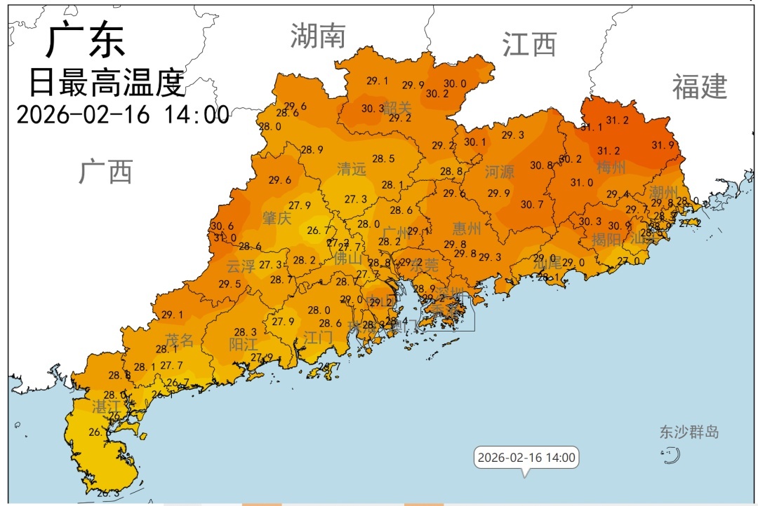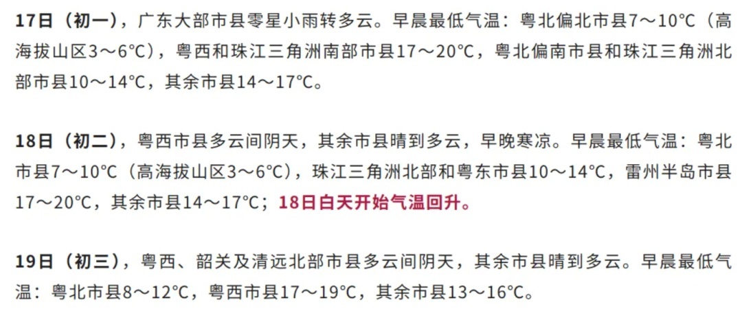 16-18日历程降温幅度:粤北下落6~8℃,其余市县下落3~5℃;18日黎明粤北高海拔山区最低气温3~6℃。