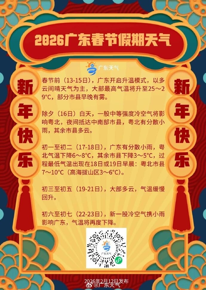 瞻望,春节假期广东无大规模强降水及强对流等高影响天气,尽管假期前期有冷空气影响,旦夕寒凉,但白日气温雀跃,总体符合出行。