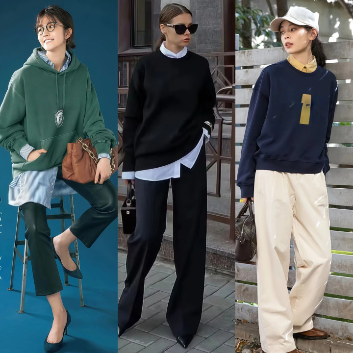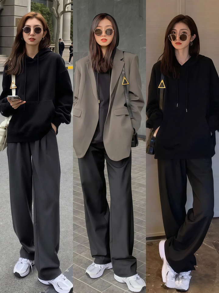 选裤子要选垂感好且带中缝线的花样,这种西装阔腿裤上身挺括不皱不变形,配上一对乐福鞋大约小皮鞋,通勤逛街都能穿,是卫衣所有这个词搭配组合里最有质感的一种。