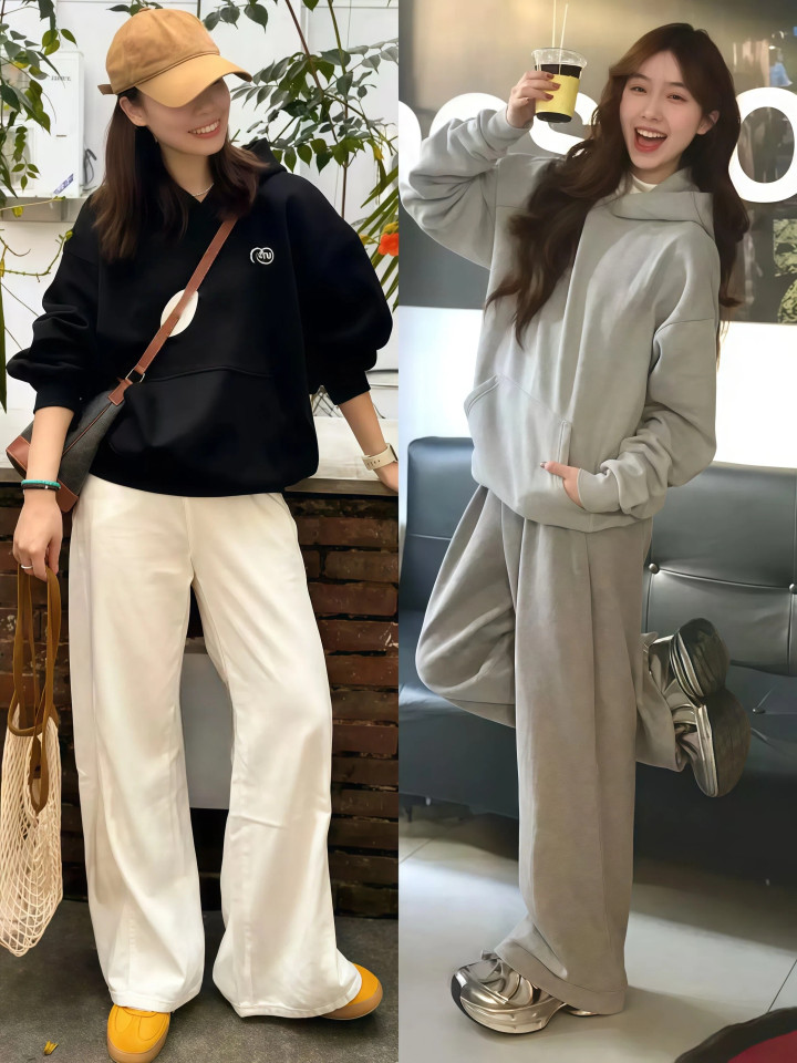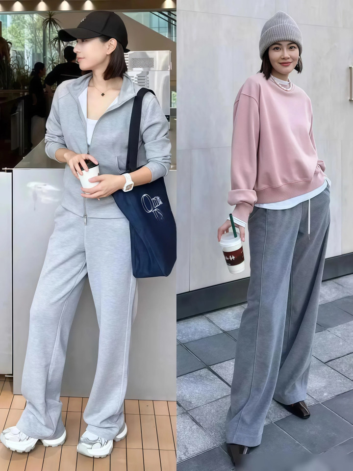 比如灰色卫衣配灰色西装阔腿裤、玄色卫衣配深灰阔腿裤、米白卫衣配奶油色阔腿裤,无须穿高跟鞋也无须卷裤脚,光靠花样颐养就能让躯壳比例看着更修长。