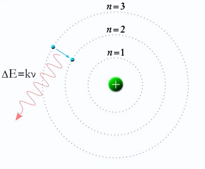 氢原子的玻尔模子,中心是原子核,电子在特定轨说念上绕着原子核动掸,当电子从高能级轨说念向粗劣级轨说念跃迁时会开释一定频率的光。(图片来源:维基百科)