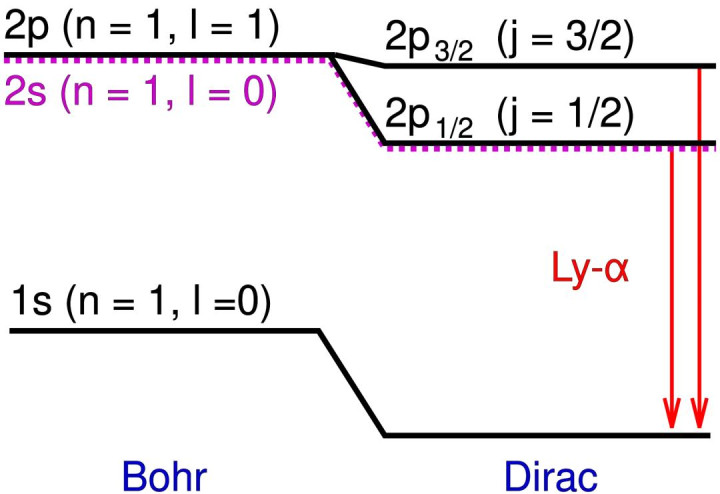 狄拉克方程关于玻尔的氢原子模子能级进行了修正,解释了莱曼α线为何会分离为双线