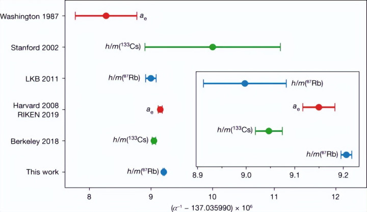 缜密结构常数的历史测量数据的汇总与对比。图中红色数据点代表基于电子反常磁矩的测量效果,蓝色与绿色数据点代表基于原子反冲的测量效果。最下方蓝色数据点为目前最精准的测量效果。(图片来源:Morel et al., Nature 2020)