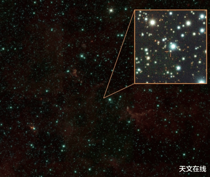 Gaia20ehk位于该图像中心。插图框中泄露了该天区的一小片区域,其中这颗恒星以橙色十字线标出。它距离地球约1.1万光年,场地围聚船尾座方针。图像由NASANSFNOIRLab华盛顿大学提供。