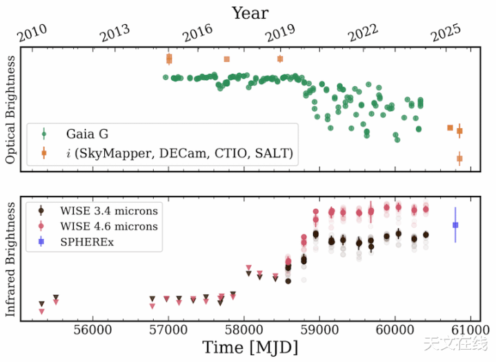 顶部的图泄露了Gaia20ehk在可见光波段的亮度变化。其中出现了3次小幅变暗,随后在2021年出现了亮度的剧烈无序变化。与此同期,底部的图泄露了并吞技巧段内该天体在红外波段的亮度变化。需要防备的是,当可见光波段亮度呈现剧烈无序变化时,红外波段亮度显赫增强。图片源自Tzanidakis等东说念主发表于《天体物理学杂志通信》及华盛顿大学的询查效果。