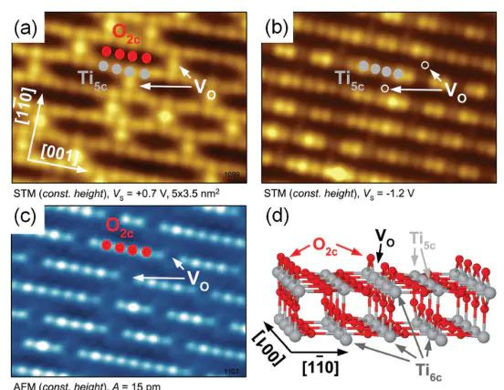 图10:金红石相的TiO2(110)名义的 STM/AFM的图像(a)空态(名义氧空位)的 STM图;(b)填充态(氧原子)的 STM图;(c)相应的AFM图,测试温度为 78K;(d)TiO2(110)名义的结构模子。扣问东谈主员借助 STM/AFM 对金红石相的 TiO2 名义的氧空位进行扣问。在大多数金属氧化物的 STM 图像中由于氧原子的电子态很少能够接近费米能级,是以图像中暴露的时常是金属阳离子的位置。而氧空位能够提供额外的两个电子局域在空位上,是以在氧离子列上的亮点为氧空位的位点。而 AFM 的另外一个上风是它对金属氧化物样品中晶格上的氧离子相当明锐博亚体育app,因此不错径直对名义的氧离子进行探伤。DOI:10.1039/c7cs00076f
