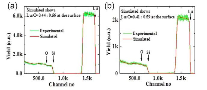 图8:卢瑟福背散射时期定量地细则助长取得的 Lu2O3 样品(a)和在氧气中退火之后样品(b)中的氧空位含量。扣问东谈主员应用该才气定量地细则了助长在 Si 衬底上 Lu2O3 薄膜中的氧空位。如图8所示的卢瑟福背散射谱,不错明晰看到 Si、O 和 Lu 边,而且不错测得助长取得的 Lu2O3 薄膜的 Lu、O 的比例为 0.44:0.56,讲明薄膜中存在氧空位。而经过氧气中退火,元素比例变为 0.41:0.59(接近期许的 Lu2O3 薄膜的 0.40:0.60),这标明氧空位含量的裁减。DOI:10.1039/c6ra22391e