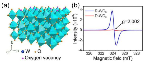 图7:(a)WO3 中氧空位分散的暗示图;(b)室温下含有氧空位(蓝线)和不含氧空位(红线)的 WO3 的电子顺磁共振谱。扣问东谈主员通过在氮气敌对中烧结取得了富含氧空位的 WO3 样品,并讲授该样品卓绝 80% 的光催化末端。然后利用电子顺磁共振,发现富含氧空位的 WO3 进展出显着对称的 g 值为 2 的电子顺磁共振信号,这是含有氧空位的特征,如图7所示。因此,电子顺磁共振是判断材料中是否存在氧空位最为径直灵验的技能。DOI:10.1021/jacs.6b04629