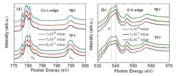 图6:在不同氧压中助长的Co0.5(Mg0.55Zn0.45)0.5O1-v薄膜中 Co 的 L 边(a)和O的K边(b)的X射线接纳谱。扣问东谈主员通过在不同氧压下助长 Co0.5(Mg0.55Zn0.45)0.5O1-v 薄膜,发现跟着助长氧压的裁减(即氧空位含量的加多),Co 的 L 边的 777.8eV 和 780.5eV 处的特征峰逐渐退化,以及 O 的 K 边的 537.6eV 处的特征峰逐渐变弱(图6)。这讲明氧空位含量的加多会影响 Co 离子周围的局域环境以及电子能带结构,而且第一性旨趣打算的末端也标明氧空位的加多会形成 O 的 K 边收缩。