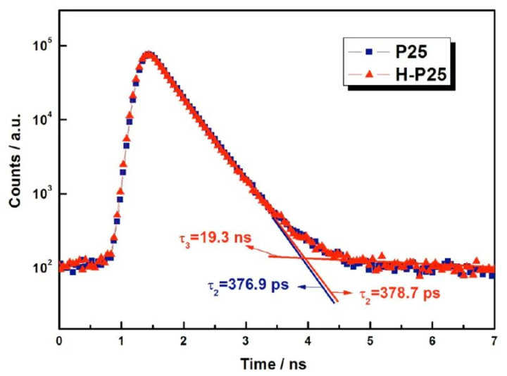 图5:P25(蓝色)和H-P25(红色)拟合线正电子寿命谱。扣问东谈主员利用正电子湮没谱扣问了经氢修饰 TiO2 中的氧空位。他们发现氢化的 TiO2 中存在有大皆由氧空位引起的 Ti3+ 离子,和一些大的氧空位的团簇。如图5所示,更长的湮没寿命 τ2 是由较大尺寸的劣势对正电子的俘获形成,而氢化 TiO2 的湮没寿命 τ2 比未氢化的小,讲明氢化的 TiO2 中存在大尺寸的氧空位团簇,这可能是由 Ti3+ 和氧空位之间的缔合导致的。DOI:10.1021/jp307573c