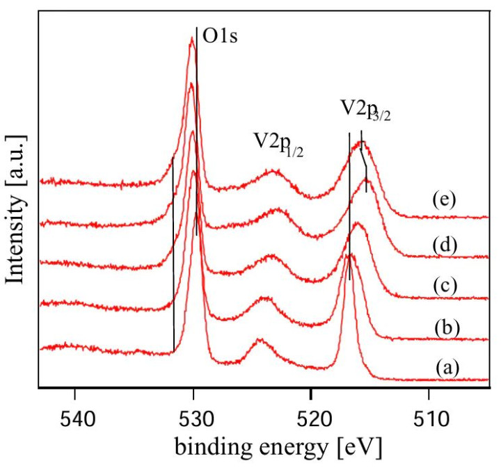 图3:在超高真空中不同温度下退火 V2O5 薄膜,其 O 1s 和 V 2p 芯能级的X射线光电子能谱。(a)为加热之前,(b)-(e)诀别为 200℃、300℃、400℃退火 1h 之后。扣问东谈主员利用 XPS 扣问 V2O5 薄膜的热力学性质,发现 400℃ 下在真空中退火不错在薄膜中通常出氧空位,从而逐渐还原 V2O5 薄膜。如图3所示,跟着真空中退火温度的培育,V 的峰(2p3/2和 2p1/2)逐渐变宽,并向低勾通能的场所迁移,而 O 的峰(1s)逐渐向高勾通能的场所迁移,这标明了氧空位的加多以及 V 离子价态的裁减。在缺氧的 CeO2-x、TiO2-x 以及 ZnO 等材料中也不雅察到了这种步地。DOI:10.1016/j.apsusc.2004.05.112