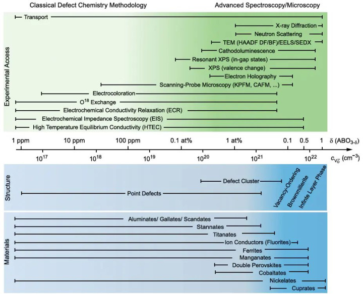 图2:可用于探伤不同数量级氧空位浓度(绿色)和不同材料体系中空位发生的践诺才气(蓝色)。DOI:10.1063/1.5143309