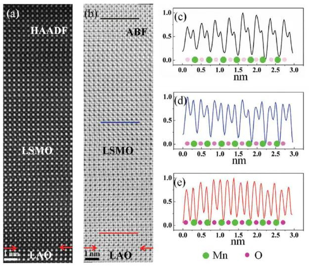 图9:用离子液体的顶栅对 La0.8Sr0.2MnO3/LaAlO3抽氧之后的 STEM图像。(a)高角环形暗场像(High Angle Annular Dark Field,HAADF);(b)ABF 像;(c)、(d)、(e)诀别为离名义不同距离的黑、蓝、红线位置的MnOx层的Mn 原子和O原子的强度图。扣问东谈主员构筑用离子液体行为栅极的La0.8Sr0.2MnO3/LaAlO3场效应结构,用环形明场像不雅察了 La0.8Sr0.2MnO3薄膜中氧空位的分散。由于外加电场作用下离子液体中残余水的主张使薄膜中产生了氧空位,ABF 的末端暴露,La0.8Sr0.2MnO3 薄膜中越接近名义的氧空位浓度越高,如图9所示。但本色上 ABF 并不适合径直测量氧空位。因为 ABF 是关连衬度,对厚度、名义浑浊、应力等皆相比明锐,很难细则原子柱强度变化是否是由空位产生的。