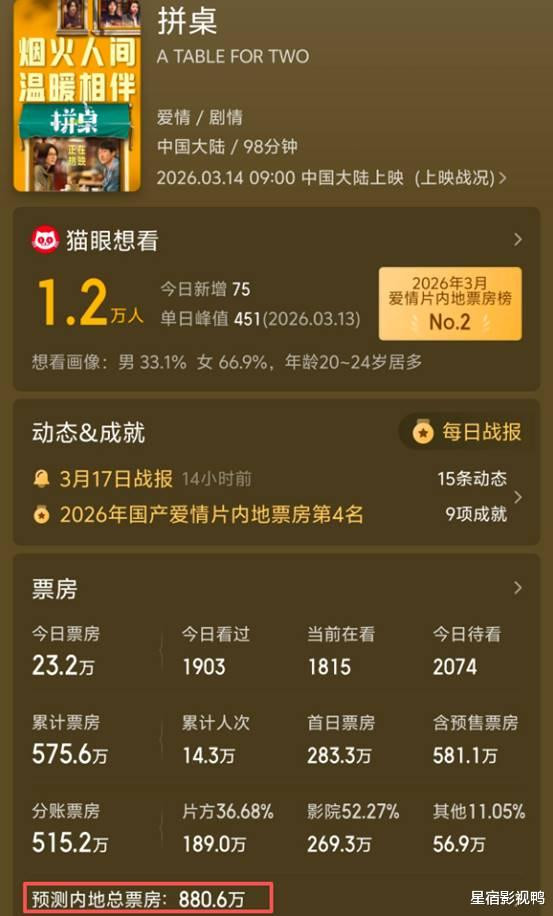 但这部《拼桌》的忖度票房才880万,算是砸碎了爱情片的饭碗。