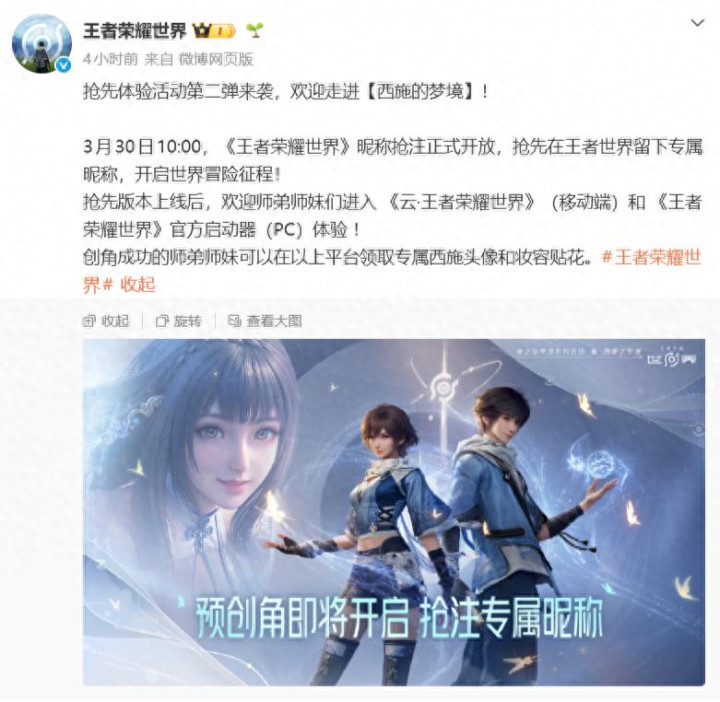 DoNews3月29日音书,3月29日,腾讯《王者荣耀寰宇》官方晓示,3月30日10:00将注意敞开昵称抢注。另外,博亚体育app中国官方入口抢先版块上线后,玩家可在《云 · 王者荣耀寰宇》(迁移端)和 《王者荣耀寰宇》官方开动器(PC)体验。