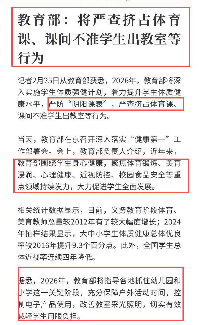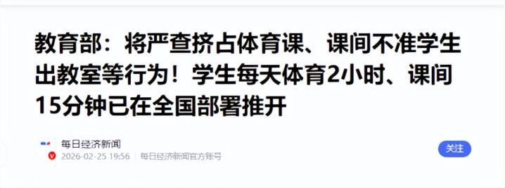 课间15分钟、每天体育举止2小时,已在宇宙悉数省份全面部署,任何学校不得占用、不得辞谢学生走出教室。